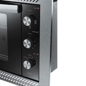 Forno de embutir elétrico Atlas U Top com capacidade de 44 litros, grill, timer com desligamento automático, isolamento térmico em lã de basalto, moldura em aço inox escovado, vidro duplo removível e acabamento interno Limpa Fácil.Timer