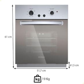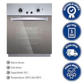 - O Forno de Embutir a Gás Venax Cristallo 50L combina funcionalidade, segurança e design moderno para transformar sua experiência na cozinha.