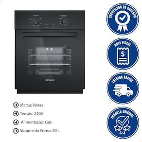 - O Forno de Embutir a Gás Venax Totale Nero 50L é a escolha ideal para quem busca praticidade e eficiência com design moderno.