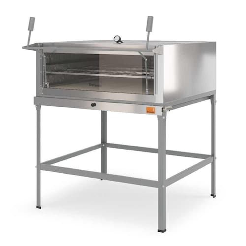 - Cavalete desmontável: proporciona praticidade e permite opções de alocação; Acabamento externo em aço inox; - Interior em aço galvanizado: resistente à oxidação; - Porta com vidro temperado 4mm e abertura tipo guilhotina: proporciona melhor aproveitamento do espaço interno; - Gaveta com amparo de fuligem; - Termômetro com escala de 0 a 400C localizado na parte superior para melhor visualização; - Grade removível com opção de 2 grades para melhorar o rendimento produtivo; - Isolamento em lã de rocha basáltica de 50mm de espessura em todas as paredes: garante melhor capacidade térmica; - Lastro em pedra refratária; - Modelo a gás (GLP) baixa pressão.