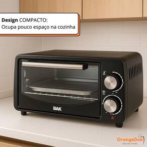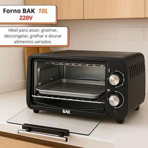 Forno elétrico de bancada com capacidade de 10 litros, potência de 1000W, termostato ajustável e timer com desligamento automático.Forno autolimpante