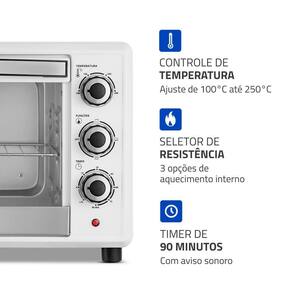 Itens Inclusos: 01 Forno Elétrico; 01 Grelha com regulagem de altura; 01 Manual de instruções com livro de receitas