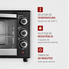 Forno elétrico Mondial Family II FR-42 com capacidade de 42 litros, 1600W de potência, timer de 90 minutos, seletor de resistência e controle de temperatura de 100°C a 250°C.Forno autolimpante