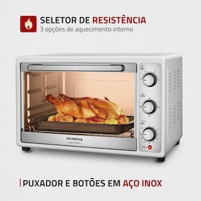 O forno elétrico Grand Family II FR-52-W da Mondial tem muito espaço para você caprichar nas receitas da sua família. Com capacidade para 52 litros, ele é multifuncional: aquece, cozinha, tosta, assa, gratina e grelha os alimentos. Possui controle de temperatura, grelha com regulagem de altura, timer de 90 minutos com desligamento automático e alta potência de 1800W. Saiba mais sobre o FR-52-W da Mondial: