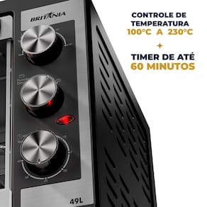 Forno elétrico Britânia com capacidade de 49 litros, dupla resistência (superior e inferior), seletor de temperatura de 100°C a 230°C, timer de 60 minutos com sinal sonoro e desligamento automático, grelha deslizante em inox ajustável em 3 níveis de altura, porta de vidro temperado, luz interna e bandeja coletora de gordura removível. Potência de 1500W (127V) ou 2000W (220V). Instalação de bancada.Forno autolimpante