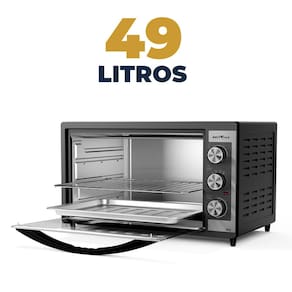Forno elétrico Britânia com capacidade de 49 litros, dupla resistência (superior e inferior), seletor de temperatura de 100°C a 230°C, timer de 60 minutos com sinal sonoro e desligamento automático, grelha deslizante em inox ajustável em 3 níveis de altura, porta de vidro temperado, luz interna e bandeja coletora de gordura removível. Potência de 1500W (127V) ou 2000W (220V). Instalação de bancada.Forno autolimpante