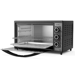 Dupla resistência | Timer de 60 minutos com desligamento automático | Sinal sonoro | Grelha em inox deslizante com 3 níveis de altura | Seletor de temperatura de 100°C a 230°C | Porta de vidro temperadoForno autolimpante
