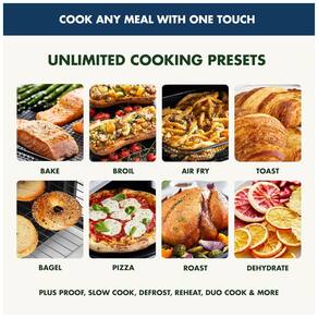 Design Multifuncional: Versátil para qualquer receita, com funções de assar, grelhar, air fry, tostar, preparar bagels, pizza, assar carnes, desidratar, fermentar, cozinhar lentamente, descongelar, Duo Cook e muito mais. Um verdadeiro aliado na cozinha!