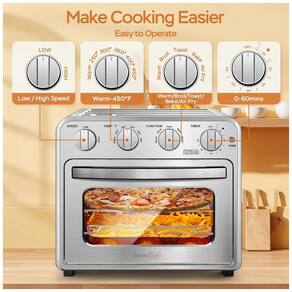 Cozimento Multifuncional: Equipado com quatro botões de controle – timer, temperatura, função e velocidade – o forno é fácil de operar para todas as idades. Com funções para assar bolos, frango, peixe, pizza, carne, torradas e até fritas, este aparelho multifuncional é perfeito para uma grande variedade de receitas.