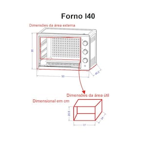 Forno de bancada com capacidade de 40 litros, timer de 60 minutos, termostato até 250°C, bandeja para resíduos, grade interna, luz piloto, grill e dourador, interior antiaderente.Forno autolimpante