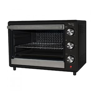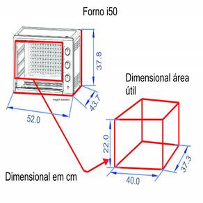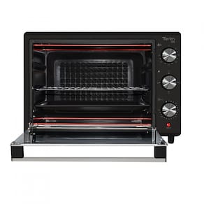 Forno elétrico de bancada com capacidade de 50 litros, timer de 120 minutos, termostato até 250°C, grill, interior antiaderente e bandeja para resíduos.Timer