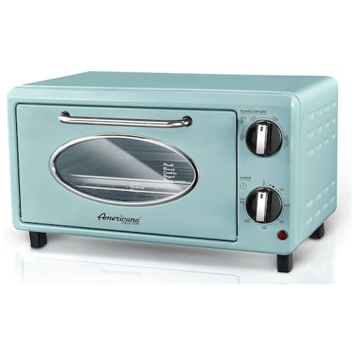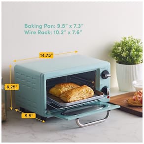 Capacidade: 10 litros Dimensões: 22,9 cm (profundidade) x 36,8 cm (largura) x 25,4 cm (altura) Peso: 3,7 kg Faixa de Temperatura: 93°C a 232°C Potência: 1000 W Material: Porta de vidro e acabamento pintado Cor: Menta Tipo de Controle: Botões giratórios analógicos Recursos Adicionais: Timer ajustável de 0 a 60 minutos Termostato integrado para controle de temperatura preciso Hastes de aquecimento em vidro para calor uniforme Voltagem:110 volts Acessórios Inclusos: Assadeira esmaltada Grade com 3 posições ajustáveis Bandeja de migalhas deslizante