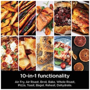 Este forno oferece 10 programas versáteis de cozimento, incluindo Air Fry, Air Roast, Grelhar, Assar, Assado Completo, Pizza, Tostar, Bagel, Reaquecer e Desidratar. É o equipamento completo para criar desde snacks até refeições completas.