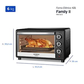 O Forno Eletrico Mondial Family II -FRN-42-B- e um convite a criatividade na cozinha. Com capacidade de 42 litros e 1.600W de potencia, ele transforma refeicoes simples em verdadeiros momentos de celebracao, seja para o dia a dia ou ocasioes especiais.