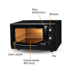 Forno elétrico de bancada com design moderno e alta performance. Possui controle automático de temperatura de 50°C a 320°C, resistência superior independente (função dourador), resistência inferior acionada pelo termostato, timer de até 120 minutos com aviso sonoro, lâmpada interna, porta com vidro duplo, revestimento interno autolimpante (EasyClean). Abertura da porta lateral e pés antiderrapantes.Forno autolimpante