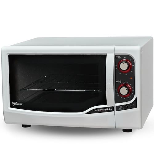 FORNO ELETRICO DE BANCADA FISCHER GOURMET GRILL G II BRANCO GII 44L 220V (9741-79180)O novo Forno Elétrico de Bancada Gourmet Grill foi feito especialmente para você que faz do ato de cozinhar, uma arte! Você terá a possibilidade de assar, dourar, tostar, gratinar e aquecer, tudo isso com apenas um produto!Com sua lâmpada interna, que possui proteção de vidro, será muito mais fácil visualizar os alimentos assados. A luz piloto é responsável por indicar quando o forno estiver ligado, trazendo para você e sua familia muito mais segurança. Você pode programar o timer em até 120 minutos e poderá contar com aviso sonoro. Além disso, possui controle automático de temperatura de 50°C a 320°C. E tem mais! Inclui dourador que deixará suas receitas ainda mais incriveis!Nosso Gourmet Grill conta com uma resistência blindada. Sua grade cromada é removível, para trazer mais prática ao seu dia a dia. Sua parte interna contém revestimento autolimpante, realizada através do processo de volatilização. Além disso, conta com bandeja esmaltada para resíduos, sendo removível também.Especificações Técnicas:- Marca: Fisher- Modelo: 9741-79180- Voltagem: 220V- Cor: Branco- Capacidade: 44 litros- Potência Total do Produto: 1775W- Potência da Resistência Superior:750W- Potência da Resistência Inferior 1000W- Potência da lâmpada: 25W- Frequência: 60Hz- Consumo: 0,60 kWh (bolo inglês)- Corrente: 220V: 7,95A- Controle: eletromecânico- Tipo de plugue: Padrão ABNT (3 pinos)- Comprimento do cabo de alimentação: 1,0m- Acompanham o produto: manual de instruções 1 grade cromada, 1 bandeja esmaltada para resíduos.- Dimensões externas do produto (AxLxP): 37 x 57,5 x 52cm- Dimensões internas do produto (AxLxP): 26,7 x 39,2 x 42,5cm- Dimensões externas da embalagem (AxLxP): 38,5 x 61,6 x 54,4cm- Peso líquido: 13,22kg- Peso bruto (embalado): 14,55kg- Garantia: 12 meses