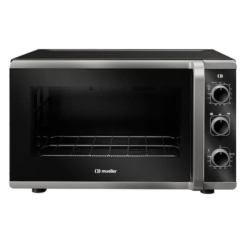 Forno elétrico de bancada Mueller com 50 litros, 3 modos de assar, grill dourador, timer sonoro com autodesligamento, luz interna, interior total clean, isolamento térmico eficiente, e função manter aquecido. Porta com vidro duplo e resistências blindadas.Forno autolimpante