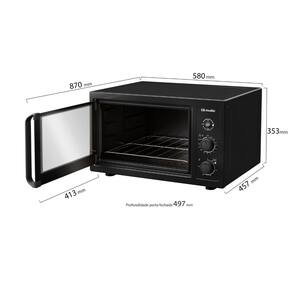 Forno elétrico de bancada com 50L de capacidade, grill dourador, função Manter Aquecido, interior total clean, timer com autodesligamento, luz interna, isolamento térmico eficiente, grade com 3 níveis de altura e bandeja protetora de resíduos.Forno autolimpante