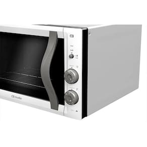 Características gerais: Marca: Mueller Modelo: MFB50F Tipo: Forno elétrico Capacidade: 50 litros Instalação: Bancada Timer: Sim Grades: Ajustável Grill: Sim Display: Não Funções: Assa, doura e aquece Bandeja para resíduos: Sim Iluminação: Sim Pés: Sim Potência: 1800W Origem: Nacional