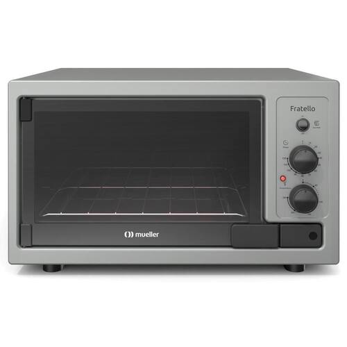 Tipo de forno: de bancada | Timer: sonoro de até 120 minutos | Peso (Kg): 10,5 | Marca: Mueller | Grill: Sim | modelo: Forno Fratello Titânio | Largura (cm): 58 | Porta do forno: Com vidro simples | Altura (cm): 35,5 | Prateleiras do forno: 1 prateleira com três níveis de altura Cor: Titânio Voltagem: 127V