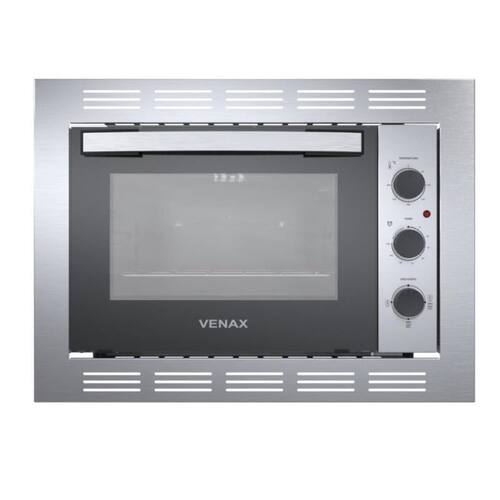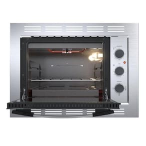 Forno elétrico de embutir com capacidade de 45L, controle de temperatura de 50C até 300C, função grill, timer grill, porta removível com vidro panorâmico espelhado e vidro duplo, puxador de alumínio e bandeja coletora de resíduos.Timer