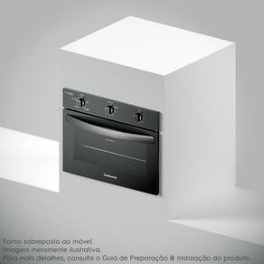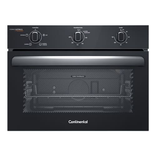 Forno elétrico de embutir Continental com capacidade de 50 litros, ideal para famílias médias. Possui design moderno em aço preto, luz interna, timer com desligamento automático. Não possui grill.Timer