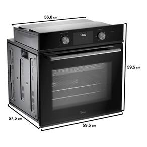 Resumo das especificacoes: Forno eletrico de embutir, alimentacao eletrica, capacidade de 80 L, tensao eletrica de 220V, potencia maxima de 2750 W. Dimensoes do produto 59,5x59,5x59 cm, peso do produto 31,50 Kg. Cor preto, material de metal e vidro. Possui luz interna, grill, timer e desligamento automatico. Acompanha grade. Garantia comercial de 12 meses."