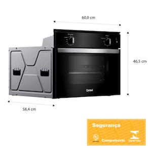 Forno elétrico de embutir Consul com capacidade de 47L, timer com auto desligamento, revestimento esmaltado, modo gratinar, prateleira deslizante e controle mecânico.Timer