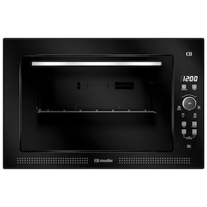 Forno Elétrico Digital de Embutir Mueller 50 L Preto (MFE50L): capacidade de 50 litros, painel digital touch com a função programar (liga e desliga automaticamente nos horários definidos), duas resistências de 900 W (superior e inferior), faixa de temperatura entre 100 C e 300 C, função grill, interior com esmalte Total Clean e frente em vidro com porta de vidro duplo para melhor retenção de calor.