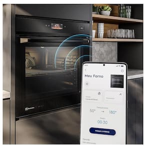 O forno pode ser controlado via aplicativo Electrolux Home + e Comando de Voz (compatível com Google Nest e Alexa), facilitando sua rotina, além de contar com a função AirFry que garante pratos ainda mais saborosos e saudáveis. Destaques Tecnologia VaporCrisp Melhora até 35% mais a suculência e crocância em suas receitas. Com a liberação de vapor durante todo processo de cozimento, é possível garantir maior suculência por dentro e mais crocância por fora. Função Regenerar a Vapor Ao reaquecer seus pratos, você mantém até 4X mais o sabor e aroma dos alimentos, sem ressecá-los, evitando desperdícios. Função AirFry Ideal para uma alimentação mais saudável e sustentável, pois garante inúmeros benefícios, como a redução de até 70% em gorduras e 34% em calorias. Características Tipo: Elétrico de Embutir Tipo de Acendimento: Automático Capacidade: 80 litros Grill Sistema de Convecção Seletor de Temperatura Painel: Touch Porta: Frontal Prateleiras: 02 Lâmpada Inclusa: Sim Funções: Assar, Convecção, Vapor Pro, Gratinar, Dourar, Food Sensor, Manter Aquecido, Travar Painel, Connect Control, Fermentar, Churrasco*, Desidratar, Air Fry, Secar cavidade, Limpar Cavidade com Vapor, Reaquecer Camera, Timer Bandejas: Bandeja Perfurada para Pães, Bandeja para Air Fry, Bandeja Coletora *(Somente com a compra e onboarding do acessório Chapa Grill) Especificações Técnicas Modelo: OE9XB Material: Acabamento Esmaltado Potência: 3269W Cor: Preto Voltagem: 220V (Não é Bivolt) EAN: 7909569411735 Garantia: 12 meses Dimensões e Peso Dimensões do produto sem embalagem (AxLxP): 596x596x613 mm Dimensões do produto com embalagem (AxLxP): 667x644x670 mm Dimensões do nicho (AxLxP): 600x600x600 mm Peso do produto sem embalagem: 24,3 kg Peso do produto com embalagem: 25,5 kg Itens Inclusos 01 Forno Elétrico 01 Food Sensor 02 Bandejas para Função AirFry 01 Bandeja para Função VaporCrisp Serviço de Instalação e Orientação de Uso Para sua comodidade e segurança, a Fast Shop dispõe do serviço de Instalação e Orientação de Uso*. Agendamos o serviço para você, executamos a instalação com equipes próprias especializadas e autorizadas pelo fabricante, ensinamos como utilizar os produtos da melhor forma e temos uma área de qualidade para acompanhar e garantir que tudo dê certo. É rápido e fácil. Você pode contratar o serviço com o nosso Televendas pelo tel.: 3003-3278 ou em uma de nossas lojas. Consulte os valores e regiões atendidas. * Verifique com nossos vendedores se a Fast Shop realiza a instalação desse produto. * A Fast Shop não realiza instalação de produtos a gás (consulte o fabricante).