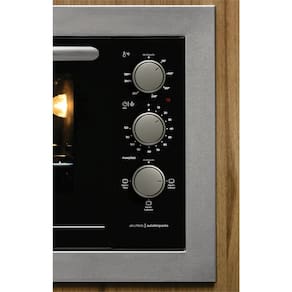 Forno Elétrico de Embutir Fischer 48L Inox com timer de 120 minutos, temperatura de 50C a 320C, três funções de assado, corpo interno autolimpante, porta com vidro duplo serigrafado e pés antiderrapantes.Timer