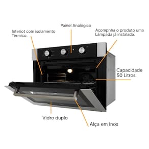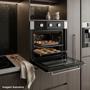 O forno conta com timer programável de até 120 minutos e controle automático de temperatura que varia de 50°C a 300°C, permitindo maior precisão no preparo de assados, massas, carnes e diversas outras receitas.