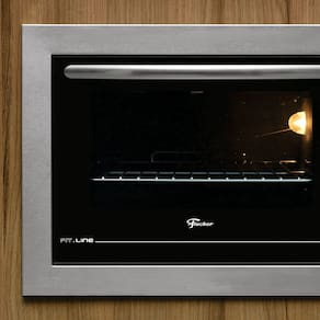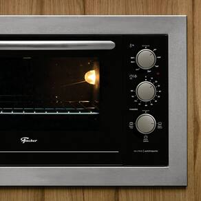 Forno elétrico de embutir Fischer Fit Line 48L Inox com controle eletromecânico, função dourar, timer de 120 minutos e temperatura máxima de 320°C. Possui grade cromada, bandeja esmaltada para resíduos e iluminação interna.Timer