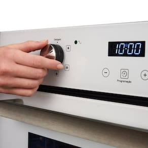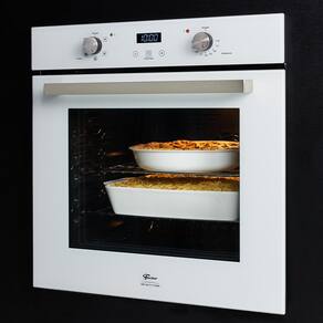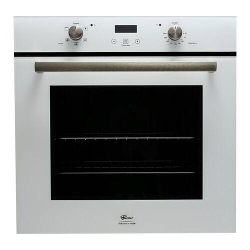 Forno elétrico de embutir Fischer Infinity Touch com capacidade de 82 litros, sistema de turbo convecção, controle de temperatura de 50°C a 250ºC, timer touch de até 10 horas, porta com vidro triplo e 5 funções (lâmpada, descongelar, turbo, grill e turbo grill).Timer