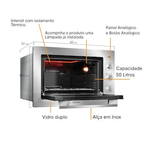 Com capacidade de 50 litros e potência total de 1800W, ele oferece excelente desempenho para preparar diversos tipos de receitas como carnes, bolos, pizzas, massas e gratinados. Seu controle de temperatura ajustável de 100°C a 300°C garante mais precisão no preparo dos alimentos.