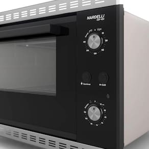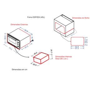 Forno elétrico de embutir com capacidade de 45 litros, acabamento em inox, botões de embutir, luz interna, dourador, timer de até 120 minutos, termostato com controle automático de temperatura até 300°C, sistema autolimpante e isolamento térmico.Timer