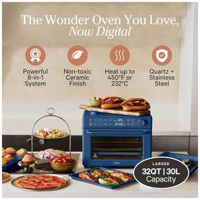 Forno elétrico digital Our Place Wonder Oven Pro 30L une alta capacidade familiar e versatilidade em oito funções: air fry, assar, tostar, gratinar, desidratar, fermentar, reaquecer e vaporizar. O painel touchscreen intuitivo permite controle preciso de tempo e temperatura. O sistema de aquecimento em quartzo e aço inox proporciona resultados uniformes e até 40% mais rápidos, alcançando até 232°C. Interior livre de químicos PFAS — não tóxico, seguro para o preparo diário. Possui três níveis de prateleiras e acessórios de longa duração: bandeja de assados, cesta de air fryer, prateleiras de arame e bandeja de migalhas. Indicado para refeições de grandes volumes, uso doméstico intenso e fácil de limpar.
