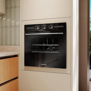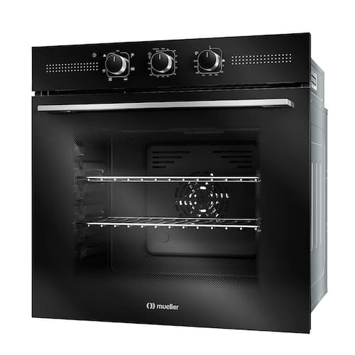 Forno Elétrico Digital de Embutir Mueller 70 L Preto MFE70K: grande capacidade de 70 litros, potência de 2.800 W, com 7 funções incluindo função fryer, temperatura ajustável de 75 C a 250 C, interior esmaltado Total Clean, porta de vidro duplo com isolamento térmico, timer digital com autodesligamento, grill, luz interna, acabamento em vidro e inox potência, versatilidade e estilo em um só forno embutido.