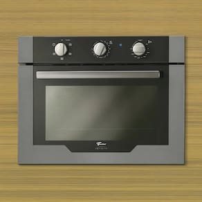 Forno elétrico de embutir com acabamento em inox escovado, tecnologia Turbo Convection para distribuição uniforme de calor, grill potente, timer programável e iluminação interna.Timer