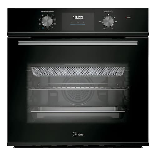 Forno elétrico de embutir com grill, luz interna, timer e desligamento automático. Possui função Airfryer.Timer