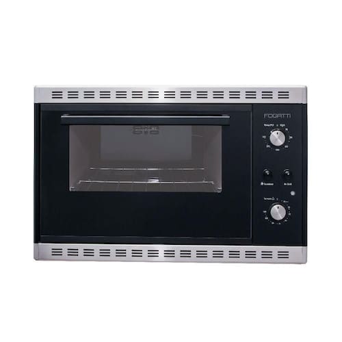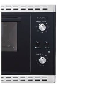 Forno de embutir com 45 litros de capacidade, timer de 120 minutos, controle de temperatura até 300°C, grill e dourador, interior autolimpante, botões retráteis, luz interna, moldura em inox com ventilação.Timer
