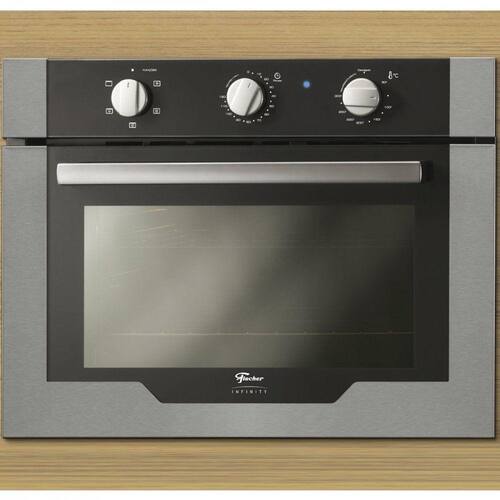 Forno Elétrico Infinity 50 litros de Embutir da Fischer. Assa, gratina e aquece, possui termostato de 50°C a 300°C, bandeja de resíduos, sistema de iluminação com luz interna para visualização dos assados e timer de 120 minutos.