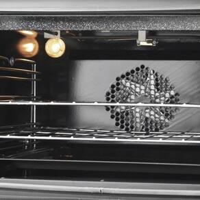 Peso Líquido: 28,57 kg Peso Bruto: 31,60kg Volume Unitário do Produto Embalado: 0,24 m³ Função Turbo: distribuição uniforme de calor Assa, gratina e aquece 5 funções de assado (incluindo descongelamento) Timer de até 120 minutos Luz piloto (indica quando o forno está ligado) Controle de temperatura de 50ºC a 300ºC Corpo interno esmaltado Easy clean preto Lâmpada interna com proteção Ventilação interna 2 grades cromadas ajustáveis em até 3 posições Porta com vidro duplo Bandeja esmaltada para resíduos Puxador com acabamento moderno Produto certificado pelo INMETRO