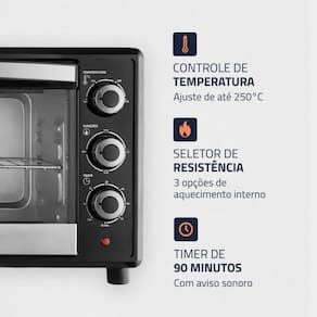 Forno elétrico Mondial Family II FR-42 com capacidade de 42 litros, 1600W de potência, timer de 90 minutos com desligamento automático, grelha com regulagem de altura e seletor de resistência.Forno autolimpante