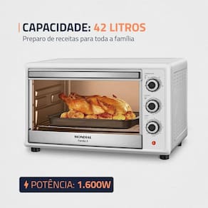 Agora você pode fazer aquela receita tamanho família sem preocupação. O forno elétrico Family II FR-42-W da Mondial possui capacidade para 42 litros e é perfeito para aquecer, cozinhar, tostar, assar, gratinar e grelhar de maneira eficiente. Possui controle de temperatura, grelha com regulagem de altura, timer de 90 minutos com desligamento automático e alta potência de 1600W.