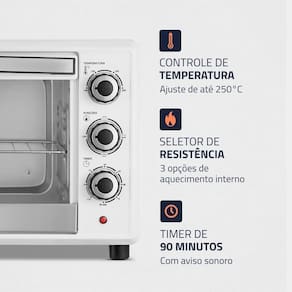 TIMER DE 90 MINUTOS: Mais liberdade e segurança para você fazer outras tarefas enquanto o forno trabalha. Com aviso sonoro, o aparelho desliga automaticamente ao término do preparo.