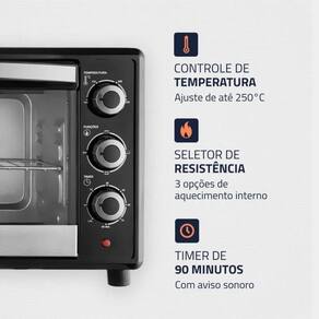 Agora voce pode fazer aquela receita tamanho familia sem preocupacao. O forno eletrico Family II FR-42 da Mondial possui capacidade para 42 litros e e perfeito para aquecer, cozinhar, tostar, assar, gratinar e grelhar de maneira eficiente. Possui controle de temperatura, grelha com regulagem de altura, timer de 90 minutos com desligamento automatico e alta potencia de 1600W.