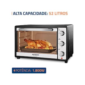 O forno elétrico Grand Family II FR-52 da Mondial tem muito espaço para você caprichar nas receitas da sua família. Com capacidade para 52 litros, ele é multifuncional: aquece, cozinha, tosta, assa, gratina e grelha os alimentos. Possui controle de temperatura, grelha com regulagem de altura, timer de 90 minutos com desligamento automático e alta potência de 1800W. Saiba mais sobre o FR-52 da Mondial: