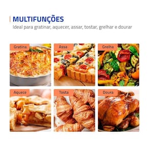 Multifunções com Seletor de Resistência: É versátil para aquecer, assar, tostar, gratinar e grelhar. O seletor com 3 opções permite distribuir melhor o calor, usando as resistências superior, inferior ou ambas.