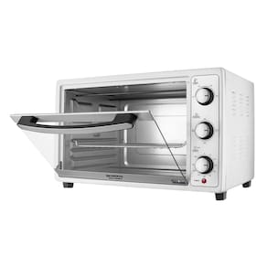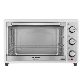 Forno elétrico de bancada com 52 litros de capacidade e 1800W de potência. Possui controle de temperatura ajustável até 250°C, timer de 90 minutos com desligamento automático e aviso sonoro. Funções: aquecer, assar, gratinar, tostar, grelhar e dourar. Grelha ajustável em três níveis. Porta de vidro e acabamento em aço inox.Forno autolimpante